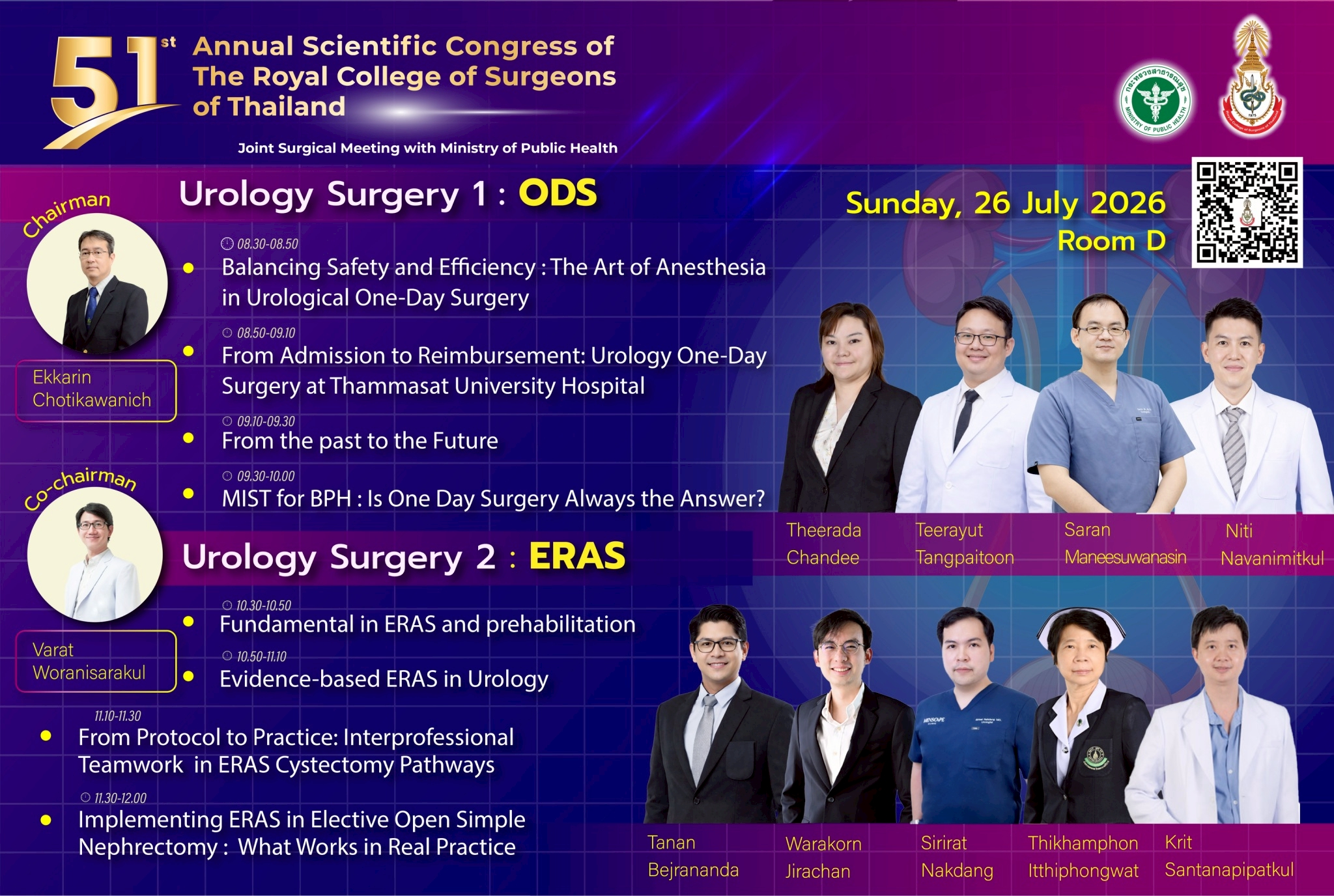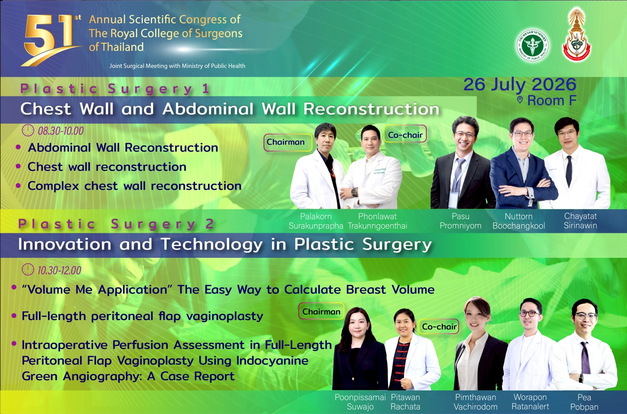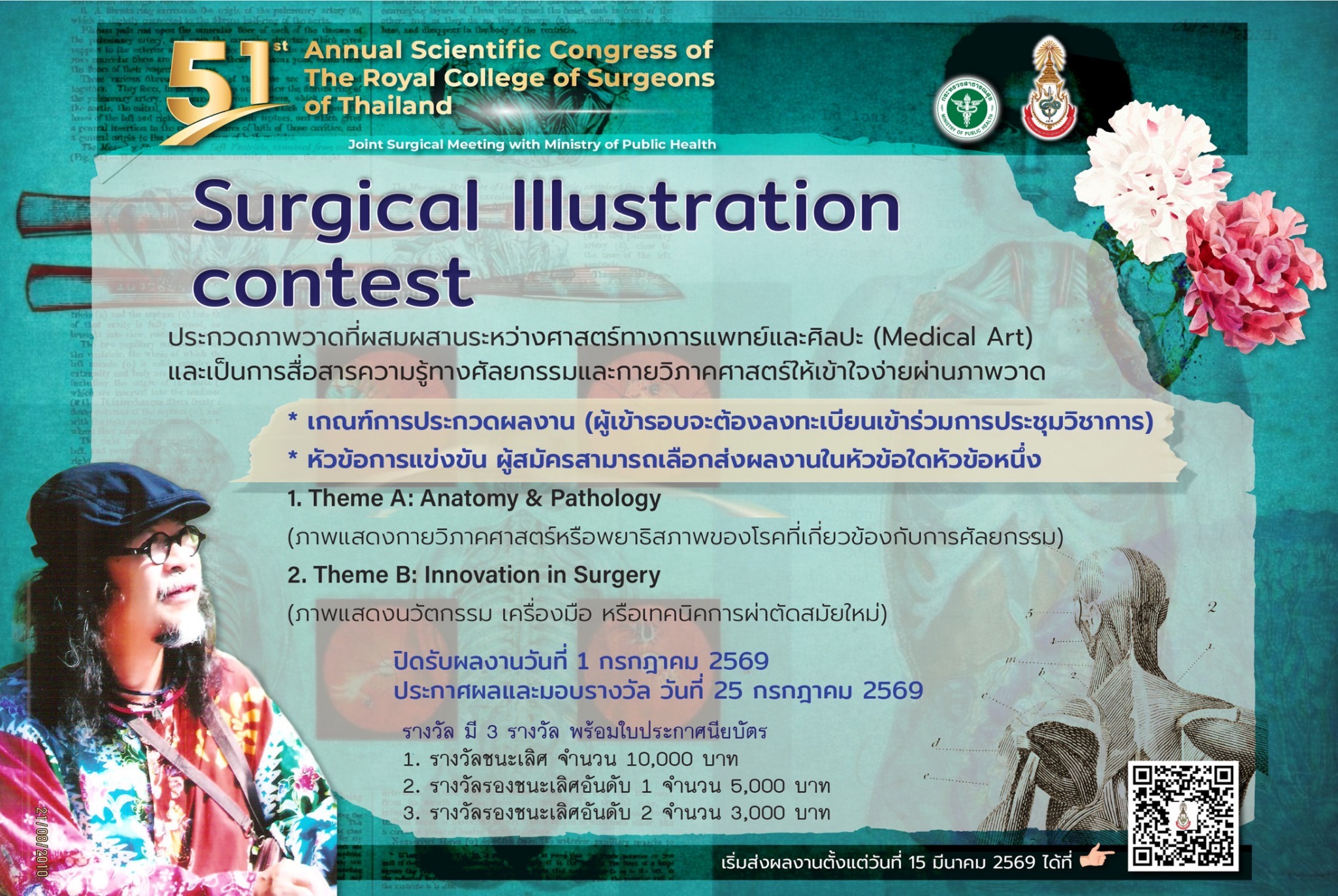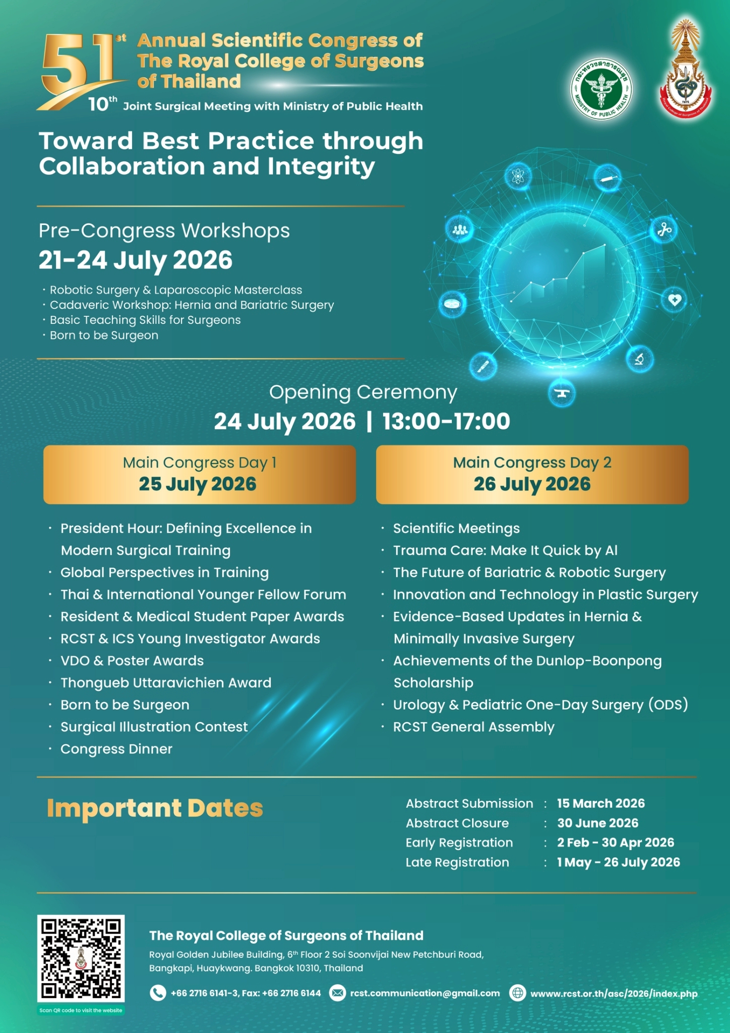 On behalf of the Organizing Committee, I am pleased to invite you to attend the 51 st Annual Scientific Congress of The Royal College of Surgeons of Thailand, jointly organized with the Ministry of Public Health for the tenth consecutive time. The Congress is scheduled to take place from 24–26 July 2026 at the Royal Cliff Hotels Group, Pattaya, Chonburi.