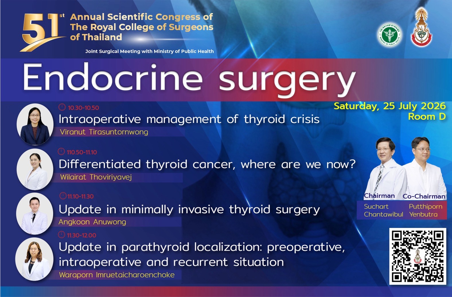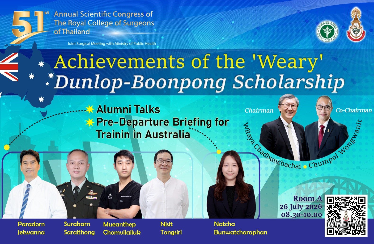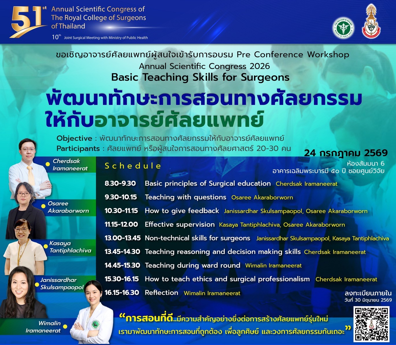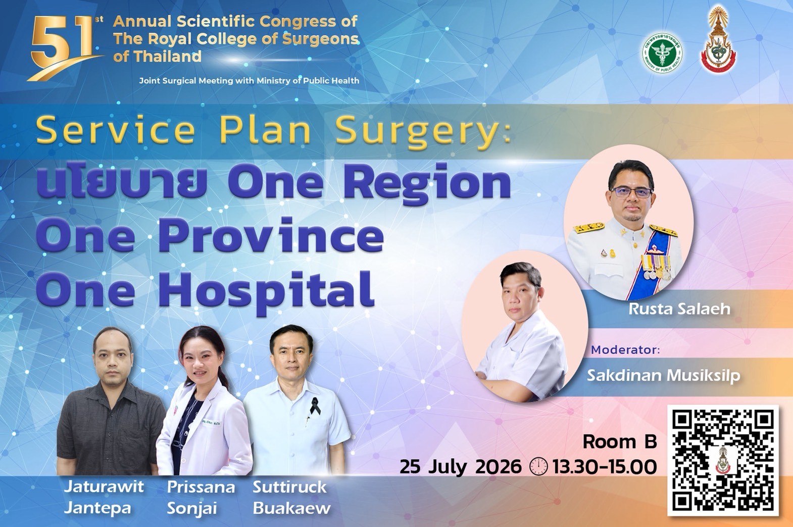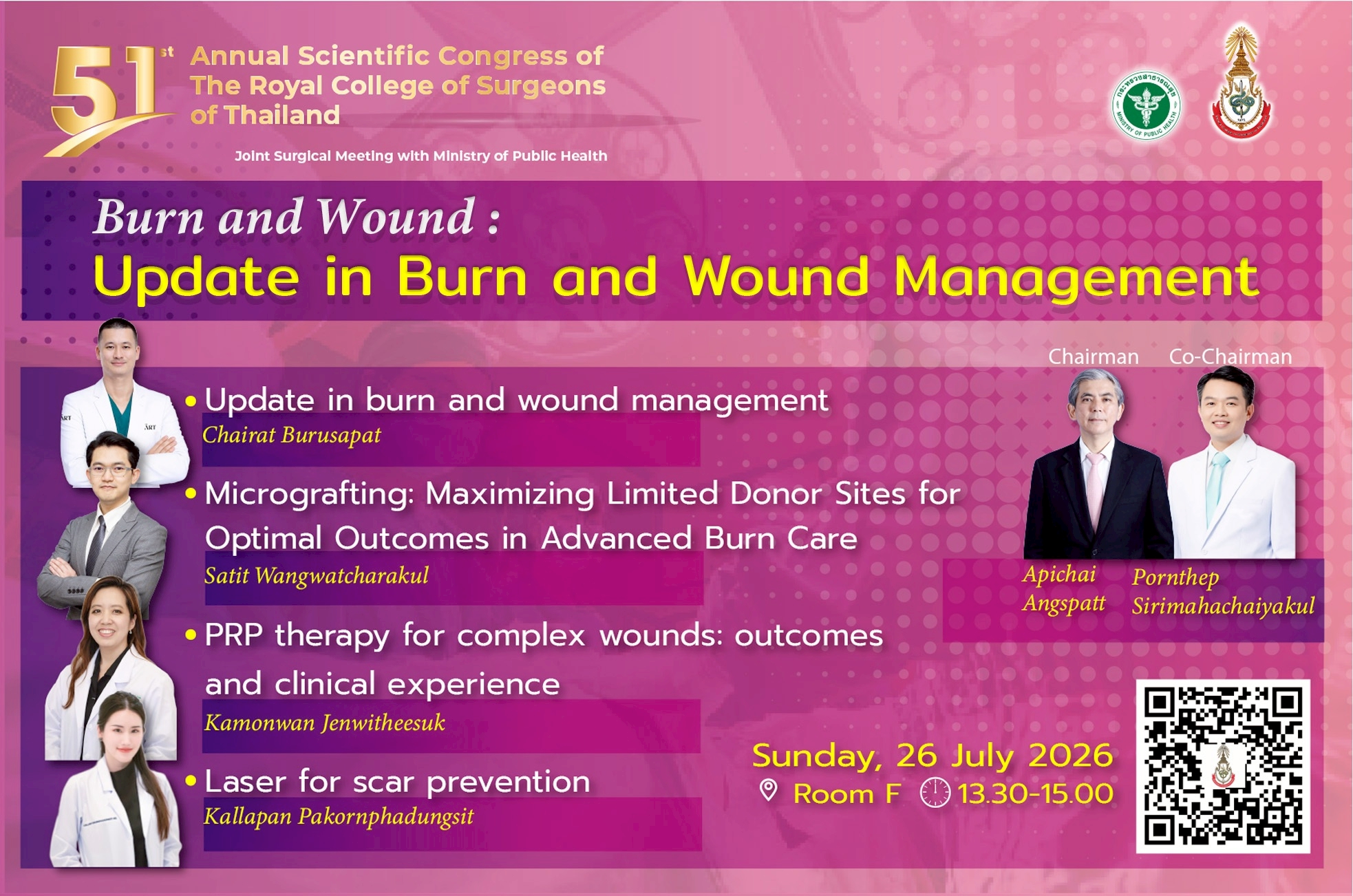 On behalf of the Organizing Committee, I am pleased to invite you to attend the 51 st Annual Scientific Congress of The Royal College of Surgeons of Thailand, jointly organized with the Ministry of Public Health for the tenth consecutive time. The Congress is scheduled to take place from 24–26 July 2026 at the Royal Cliff Hotels Group, Pattaya, Chonburi.